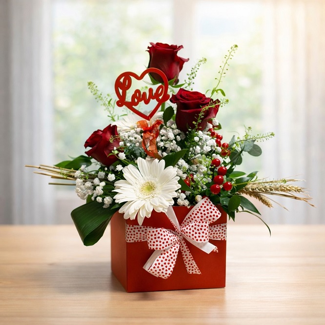 Oltre alla bellezza dei fiori, il valore aggiunto di questo prodotto risiede nel suo confezionamento. La box quadrata di un rosso vibrante è rifinita con un generoso fiocco bianco a pois rossi, che richiama uno stile romantico e un po’ “vintage chic”. In aggiunta, la composizione è sormontata da un topper sagomato a forma di cuore con la scritta “Love”, che funge da dichiarazione esplicita. Infine, la struttura solida della box permette di posizionare il regalo ovunque senza bisogno di vasi, garantendo una durata prolungata grazie alla spugna idratata interna.
